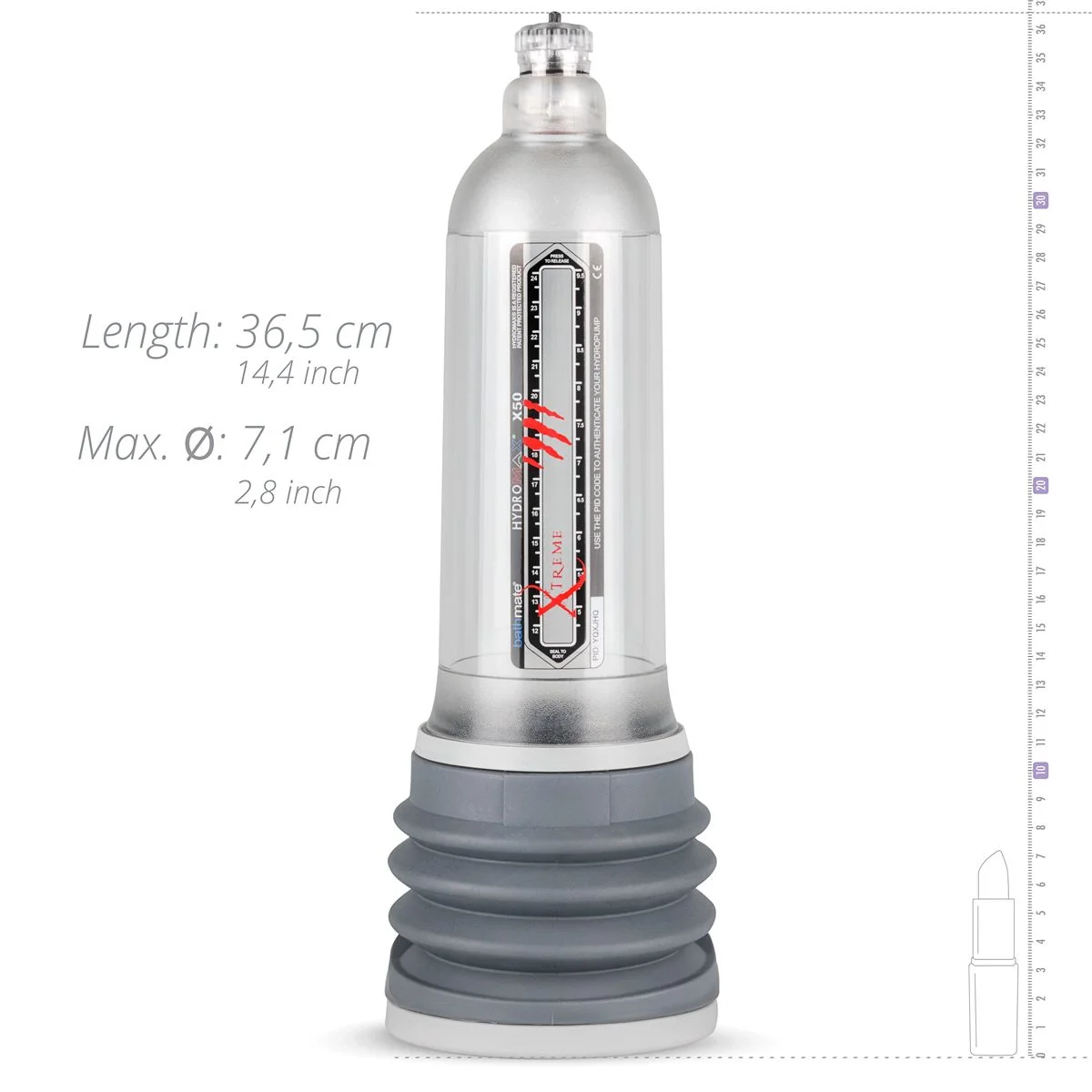 De HydroXtreme 11 is een luxe penispomp die je gebruikt met water. Vul de pomp met lauwwarm water, plaats hem over je penis en druk vervolgens de basis tegen je lichaam. Het water zal langzaam uit de pomp gaan en de penis wordt vacuüm gezogen voor meer volume. De HydroXtreme 11 is de meest krachtige pomp uit de collectie en is geschikt voor mannen met een penislengte van meer dan 23 cm (tijdens erectie). De pomp wordt geleverd met vele extra's zoals:
