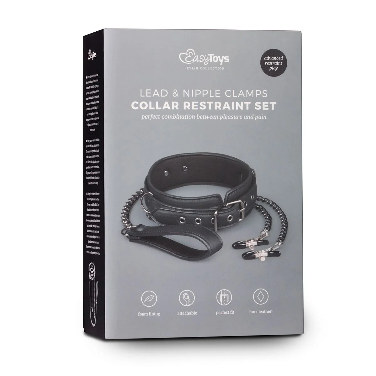 Met deze halsband inclusief tepelklemmen kan je je partner domineren en genieten van het gevoel van controle! De halsband is gemaakt van kunstleer, wat zorgt voor een luxe uitstraling. Hij is verstelbaar en zal dus altijd passen. De halsband en de klemmen zitten aan elkaar vast met metalen kettinkjes. Met deze halsband ben je verzekerd van een opwindend en sexy SM-spelletje.