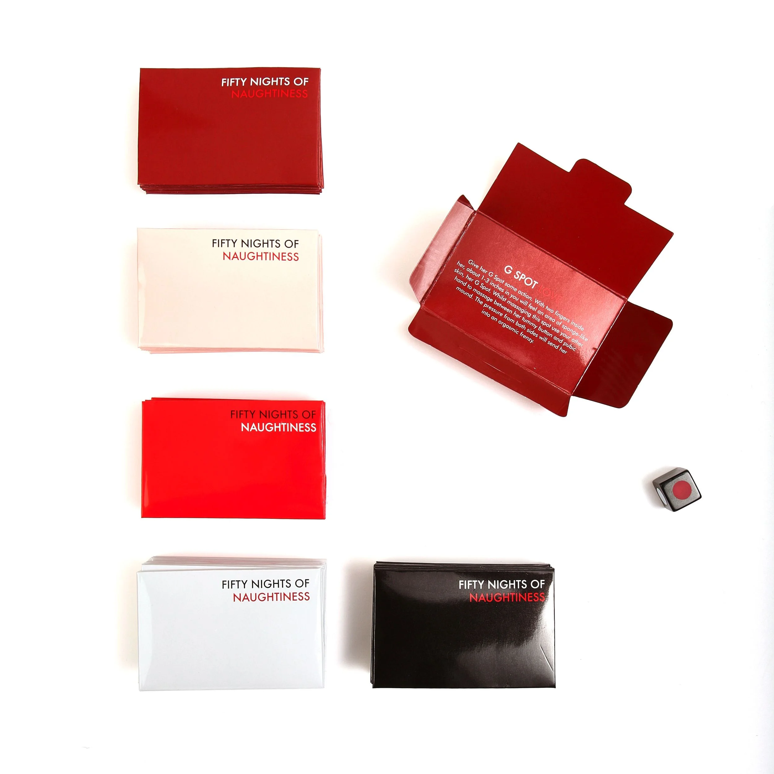 Gooi met de dobbelsteen en ontdek welk niveau van ondeugendheid jullie vanavond beleven. Gooi je geel? Dan mag je zelf een niveau kiezen dat bij je stemming past. Of je nu zin hebt in een romantisch moment of juist wat extra pit zoekt, 50 Nights of Naughtiness heeft altijd iets te bieden.