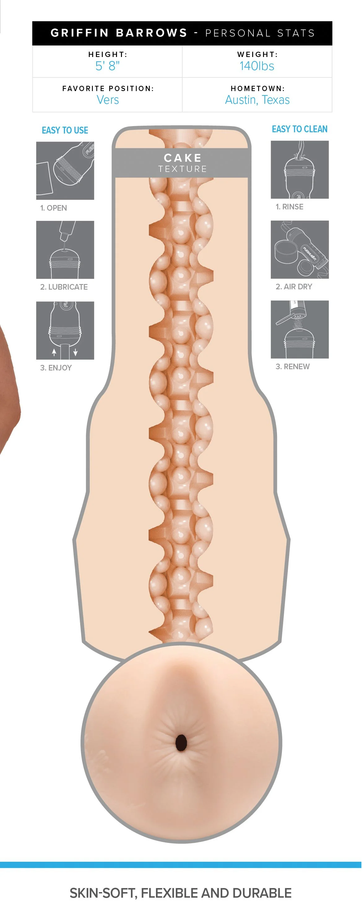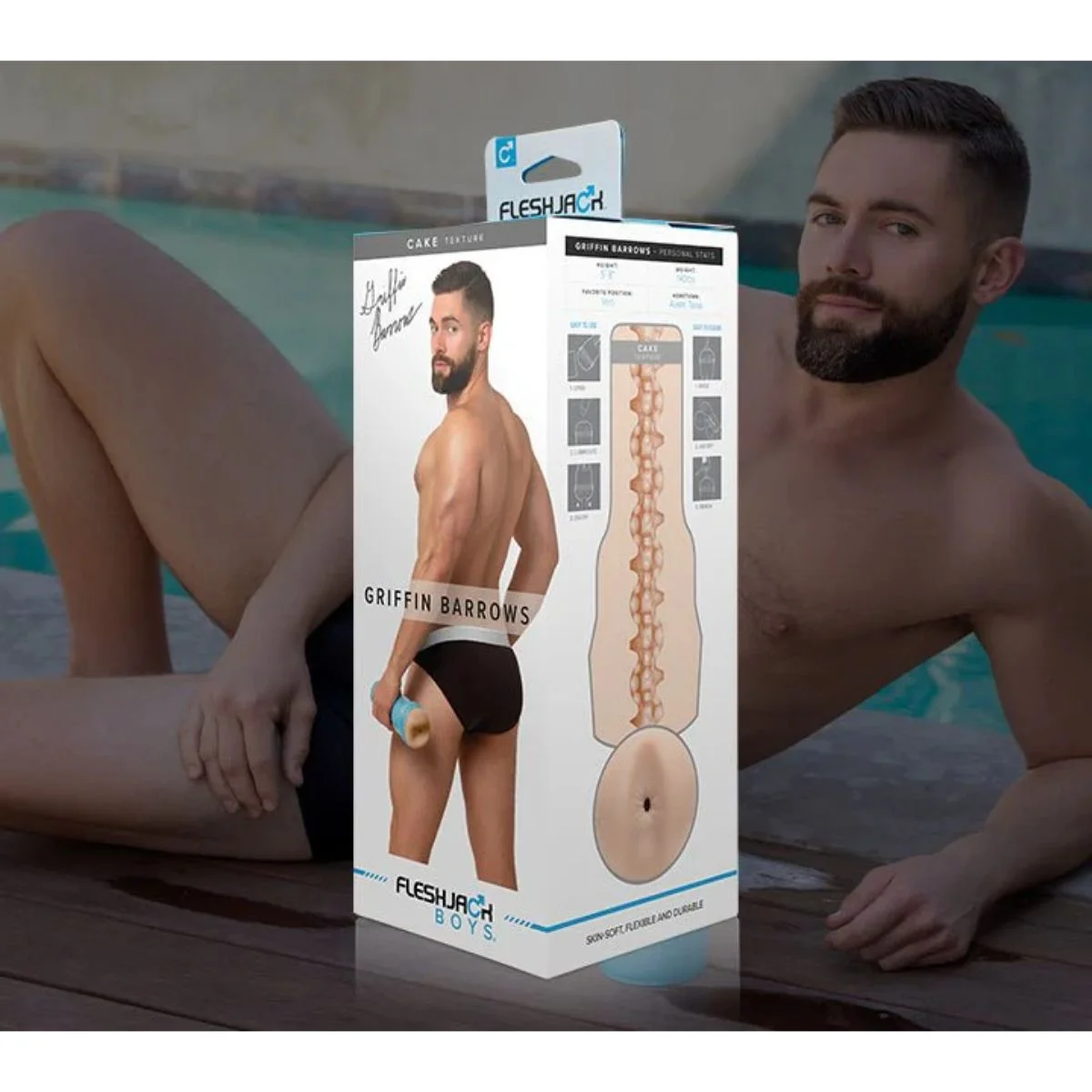 Laat je verwennen door Griffin Barrows, een heerlijke masturbator met anus opening die gemodelleerd is naar de bekende pornoster. De Fleshjack Boys serie staat bekend om zijn discrete vormgeving en doet zijn naam eer aan. De uitneembare sleeve is gemaakt van SuperSkin, een lichaamsveilig siliconen dat enorm zacht en comfortabel aanvoelt. Groot voordeel is dat dit materiaal snel op temperatuur is. De binnenkant is voorzien van noppen en ribbels en de verschillende 'kamers" hebben ieder een eigen structuur. Met de dop aan de achterzijde stel je het gewenste vacuüm in. De totale combinatie geeft een zeer realistisch en intens gevoel en zorgt voor een heerlijke ervaring. De opening is flexibel en past zich volledig aan de grootte van jouw penis. Door de plastic behuizing heb je altijd een goede grip op de masturbator. De sleeve kun je makkelijk schoonmaken en dat maakt de Fleshjack een ideale toy voor oneindig plezier.