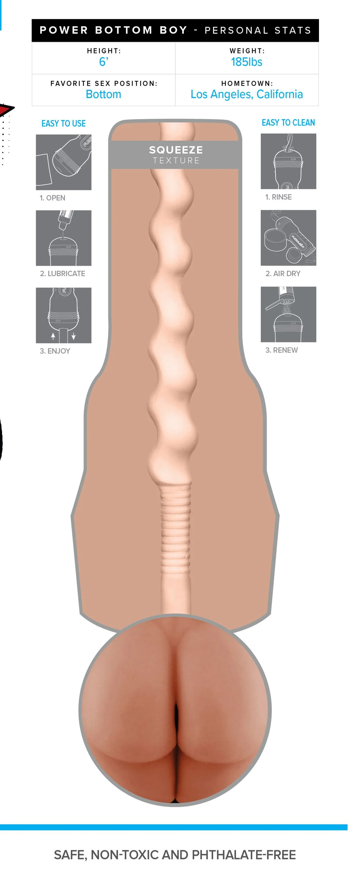 Gemaakt van het gepatenteerde Real Feel SuperSkin® – een extreem zacht en realistisch materiaal dat haast niet van echt te onderscheiden is. En dan is er nog de legendarische squeeze sensation: een structuur die aanvoelt als een echte anus, en volgens kenners wordt beschouwd als de meest realistische anale textuur die Fleshlight ooit heeft gecreëerd.