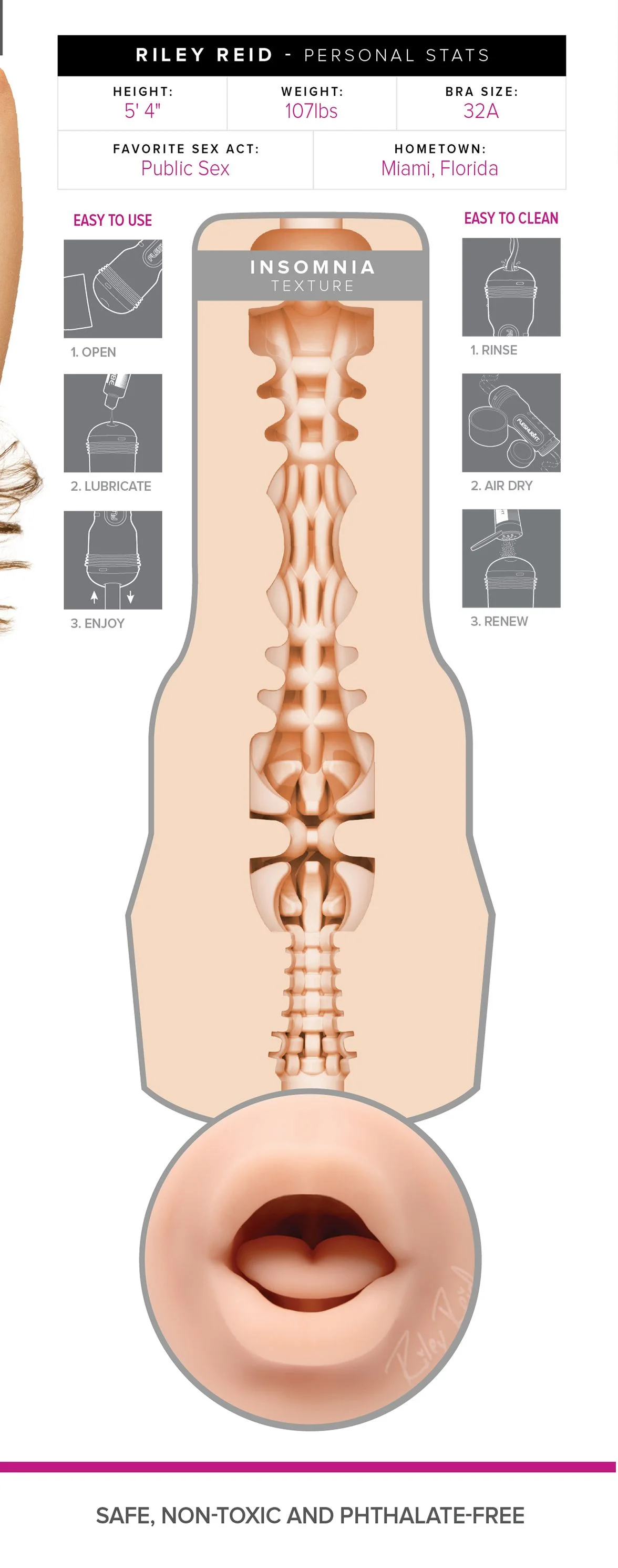 Beleef je meest opwindende orale fantasieën met de Riley Reid Insomnia Signature - Mond. Dit exclusieve Fleshlight-model brengt Riley’s zijdezachte lippen tot leven, waardoor je een realistisch en intens genot ervaart.