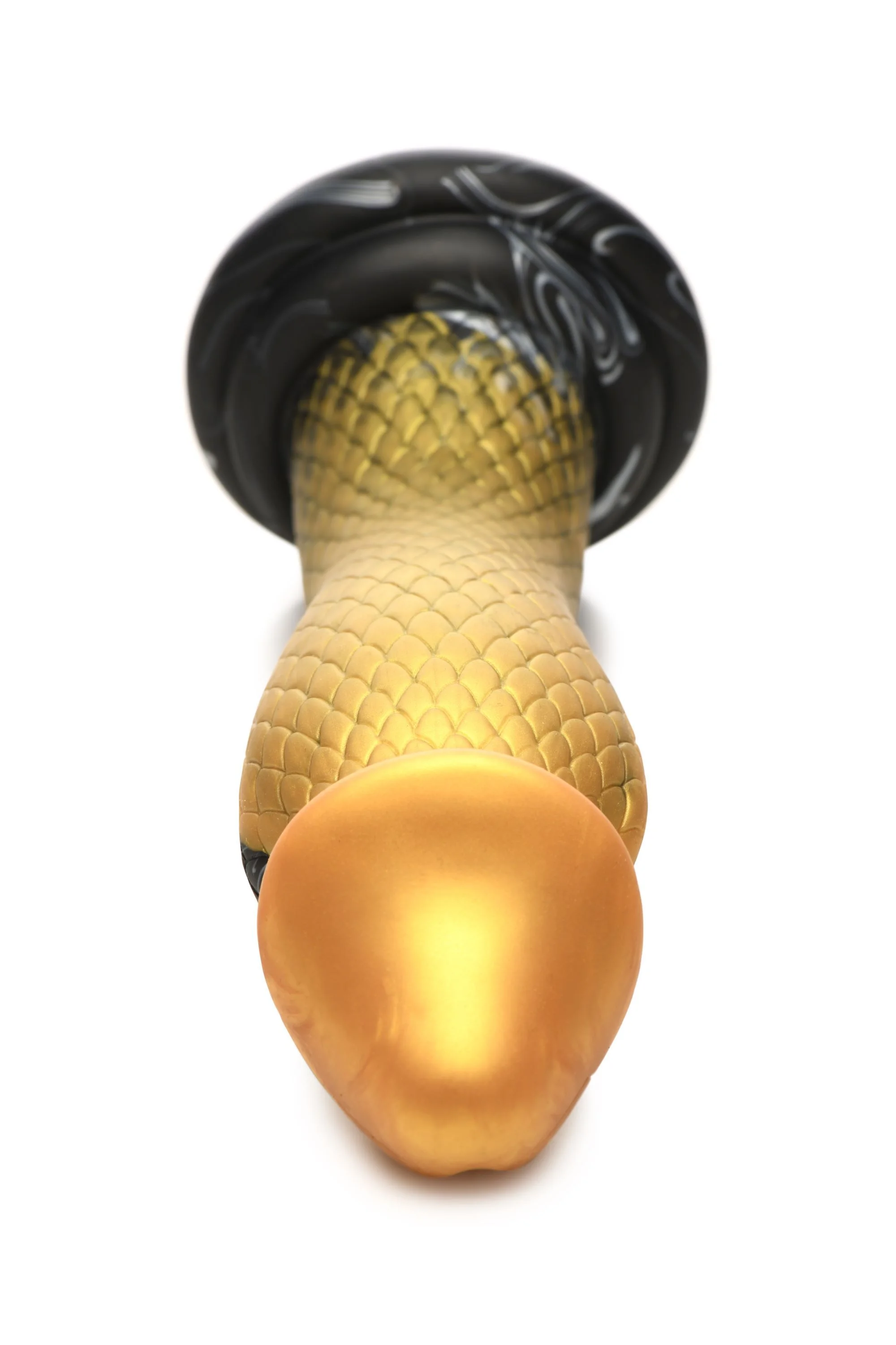 Betreed de sensuele wereld van genot met deze opvallende gouden en zwart gekleurde mamba-vormige dildo. De verleidelijke creatie, vervaardigd uit hoogwaardige siliconen, is ontworpen om te voldoen aan al je diepste verlangens en biedt een unieke ervaring.