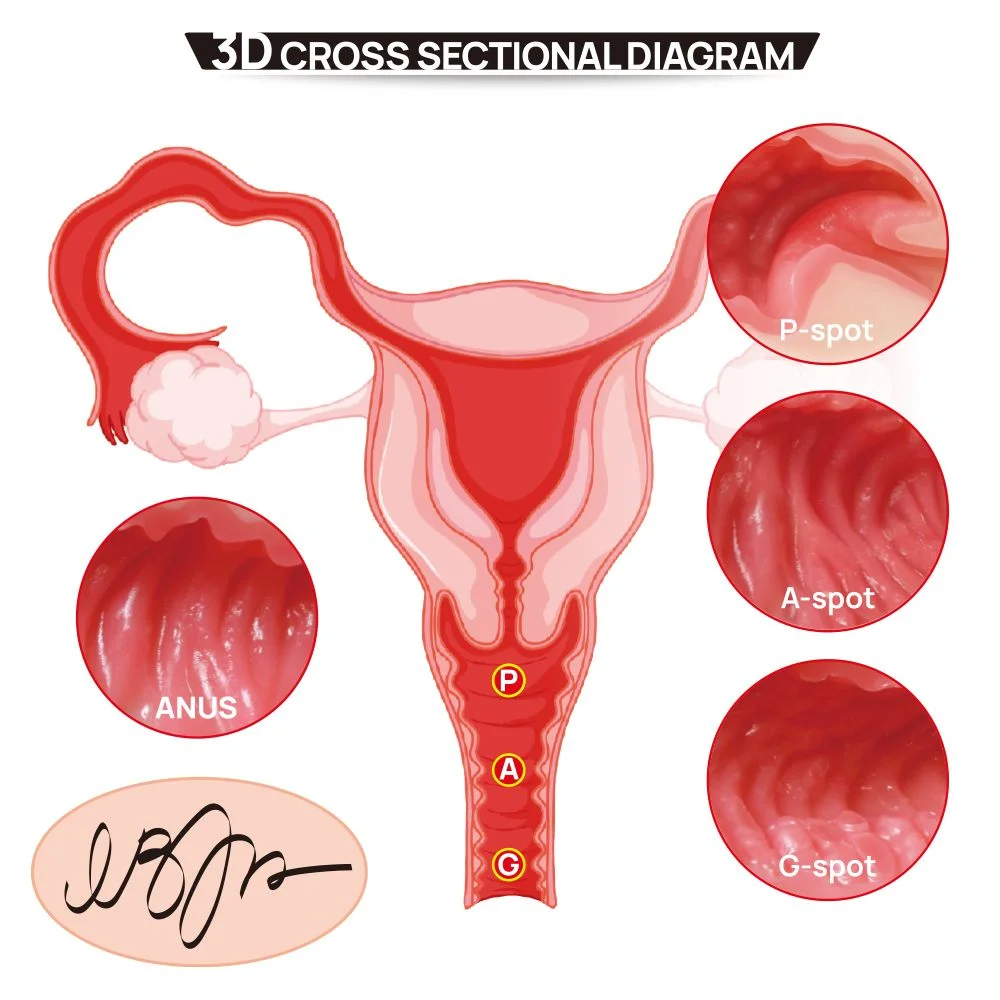 De masturbator is voorzien van een huidstructuur, realistische zachte schaamlippen, een G-spot in opgewonden staat en zelfs een A-spot en P-spot. De schacht van zowel de anus als vagina zijn voorzien van realistische ribbels en noppen waardoor je geniet van een levensecht gevoel. De opening van de vagina is 1 cm, smaller dan een echte vagina, en past zich perfect aan aan de grootte van je penis. Dankzij de platte onderkant is ze bovendien op elke gewenste ondergrond te plaatsen.
