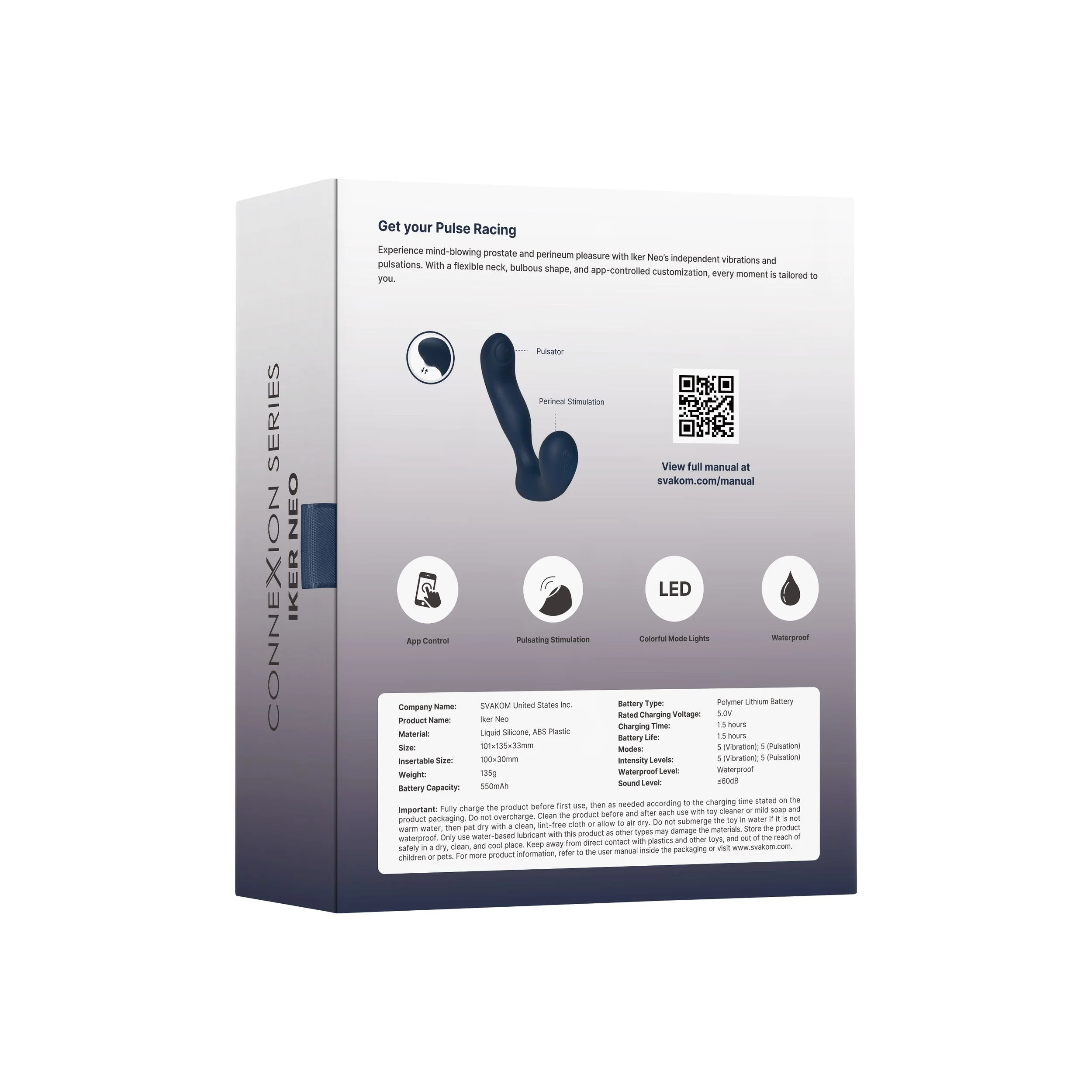 Naast zijn opwindende functies is de Iker Neo ook praktisch in gebruik. Hij is volledig waterproof en eenvoudig te reinigen, en met het stille motortje kun je zorgeloos genieten. De vibrator beschikt over een reismodus voor discreet vervoer, en een geheugenfunctie zodat je meteen verder kunt gaan waar je gebleven was. De krachtige ingebouwde 550mAh batterij wordt opgeladen via magnetische USB, biedt tot 1,5 uur speeltijd na een oplaadtijd van 1,5 uur, en laat je kiezen uit vijf vibratiestanden, vijf pulserende modi en vijf intensiteitsniveaus voor elk.
