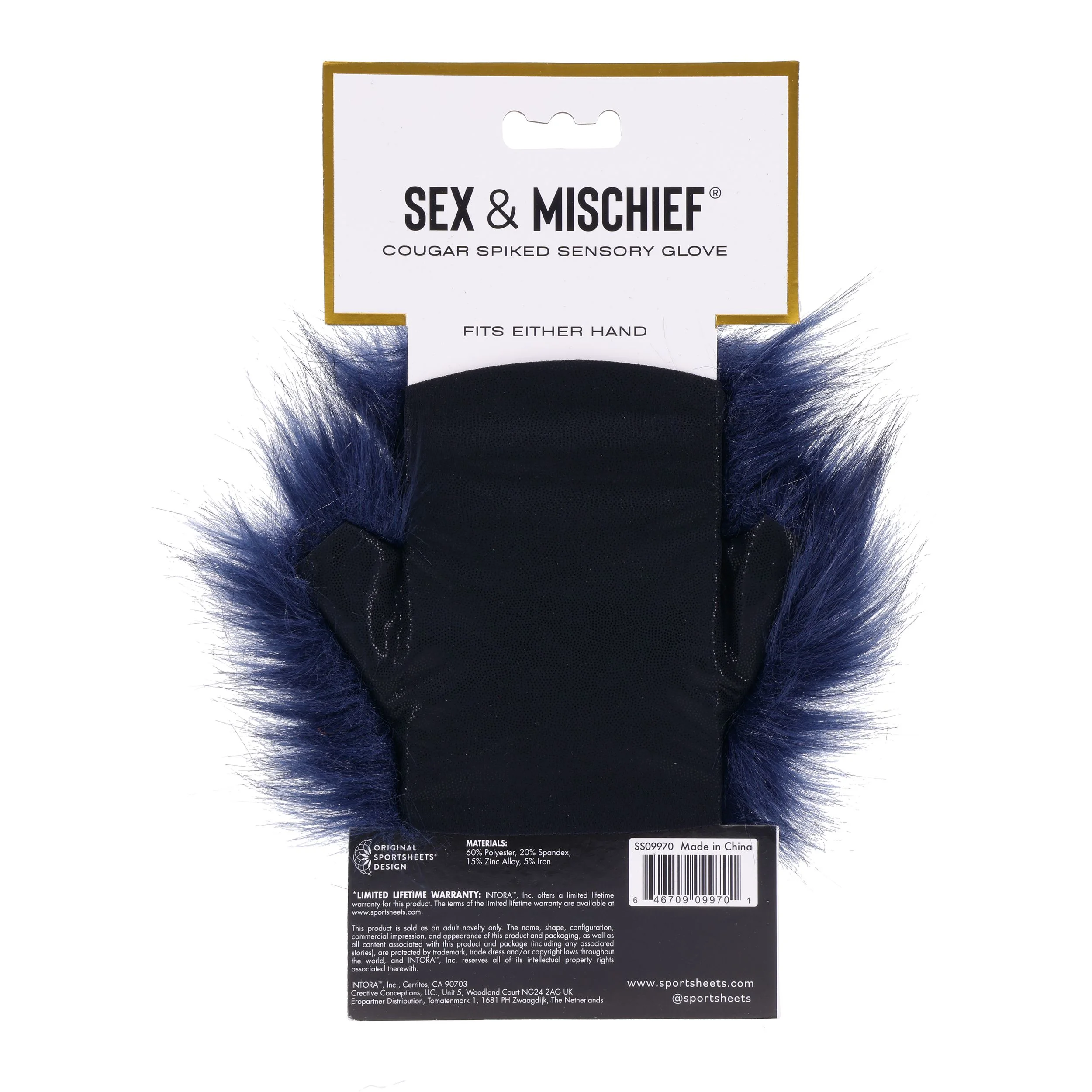 Deze handschoen, ontworpen voor de avontuurlijke geest, combineert koninklijk blauw faux bont met verleidelijke gouden spikes. Perfect om te kietelen en te prikkelen, versterkt deze handschoen elke aanraking en zorgt voor een opwindende ervaring voor beide partners.