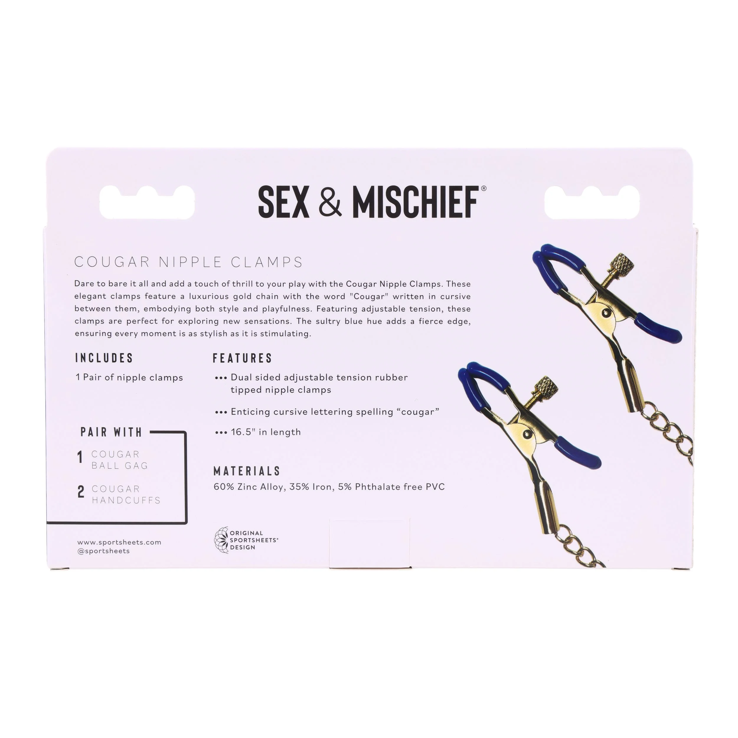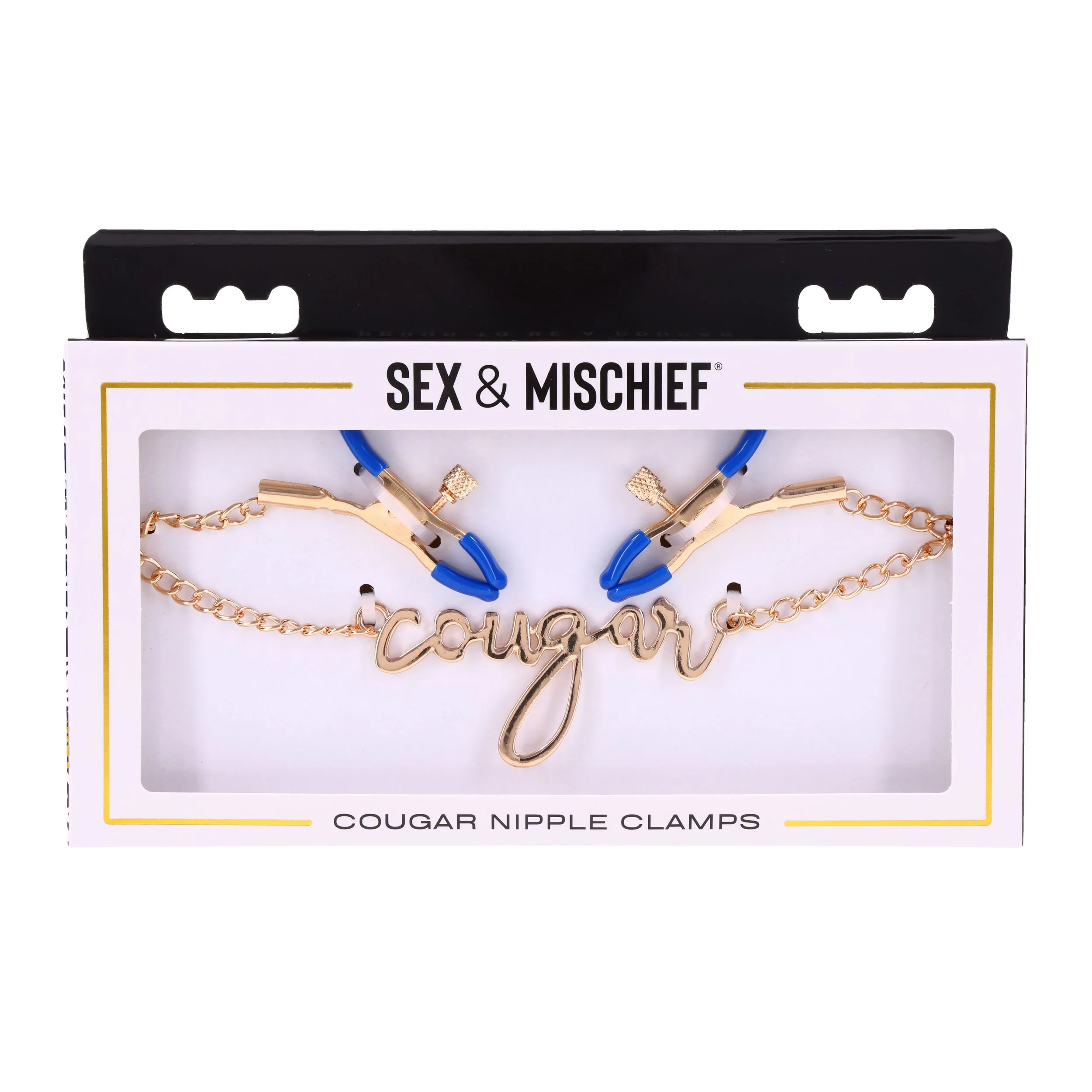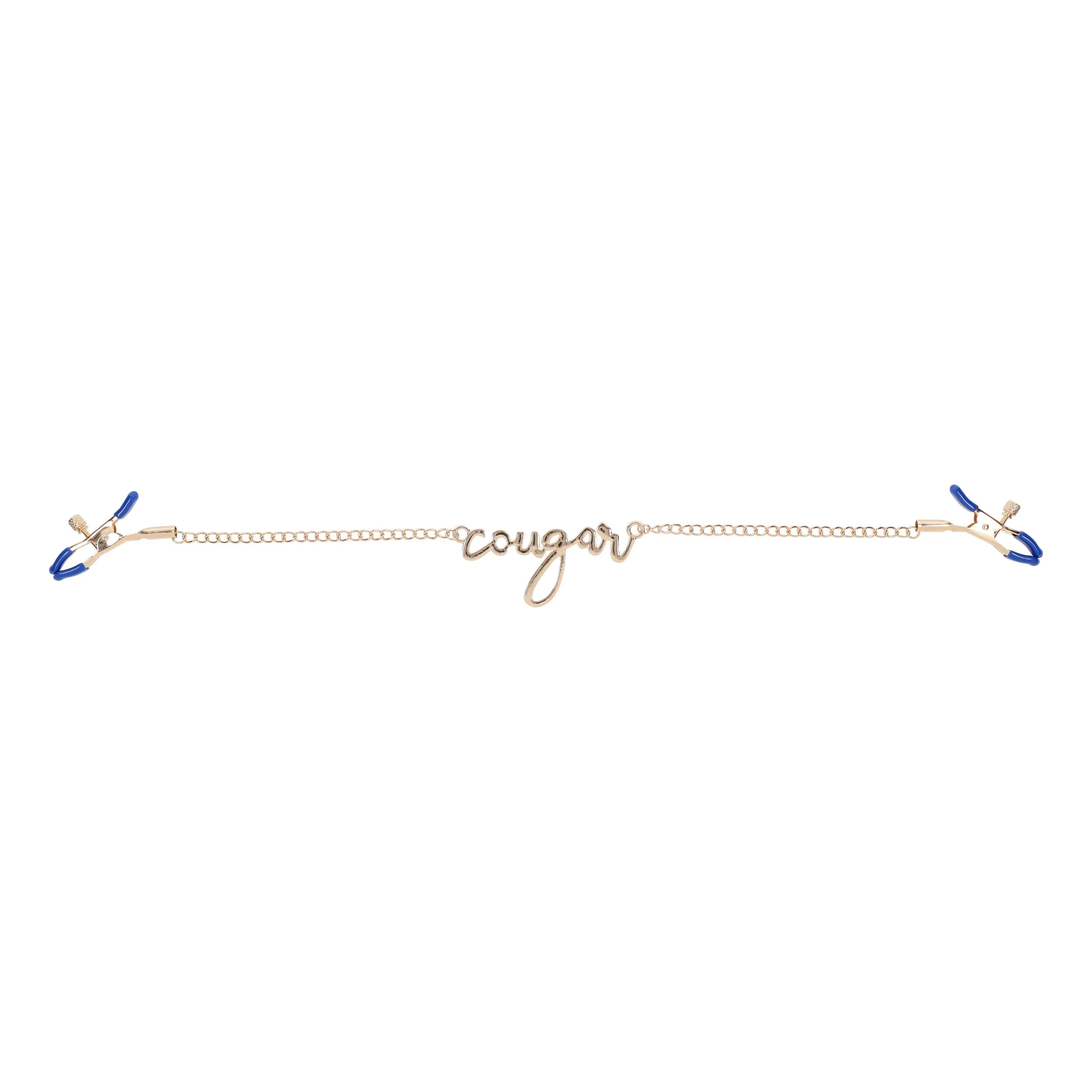 Deze elegante klemmen zijn voorzien van een luxueuze gouden ketting met de cursieve tekst "Cougar" ertussen, wat zowel stijl als speelsheid uitstraalt. Met de verstelbare spanning zijn deze klemmen perfect voor het verkennen van nieuwe sensaties. De verleidelijke blauwe kleur geeft een gedurfde uitstraling, waardoor elk moment even stijlvol als stimulerend is.