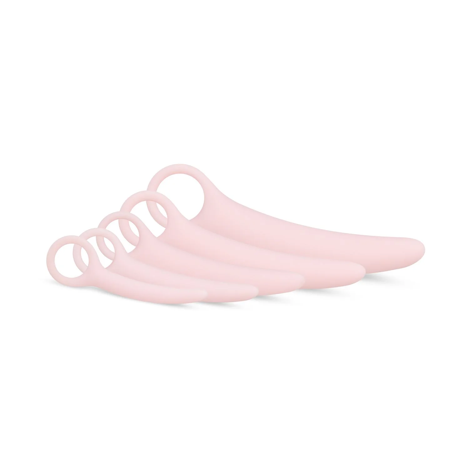 Deze dilatorset helpt bij rekoefeningen om de vagina wijder te maken en de vaginale kracht te herstellen om zo uiteindelijk comfortabele penetratie mogelijk te maken. Deze set bestaat uit 5 verschillende maten die gemakkelijk in gebruik zijn dankzij de trekring. Begin met de kleinste en werk langzaam naar de grootste toe. De dilators zijn gemaakt van zacht lichaamsveilige siliconen en zijn flexibel voor een comfortabele ervaring. Gebruik voldoende glijmiddel op waterbasis om het inbrengen te vergemakkelijken. Maak de dilators na gebruik schoon met lauwwarm water en toycleaner of milde zeep.