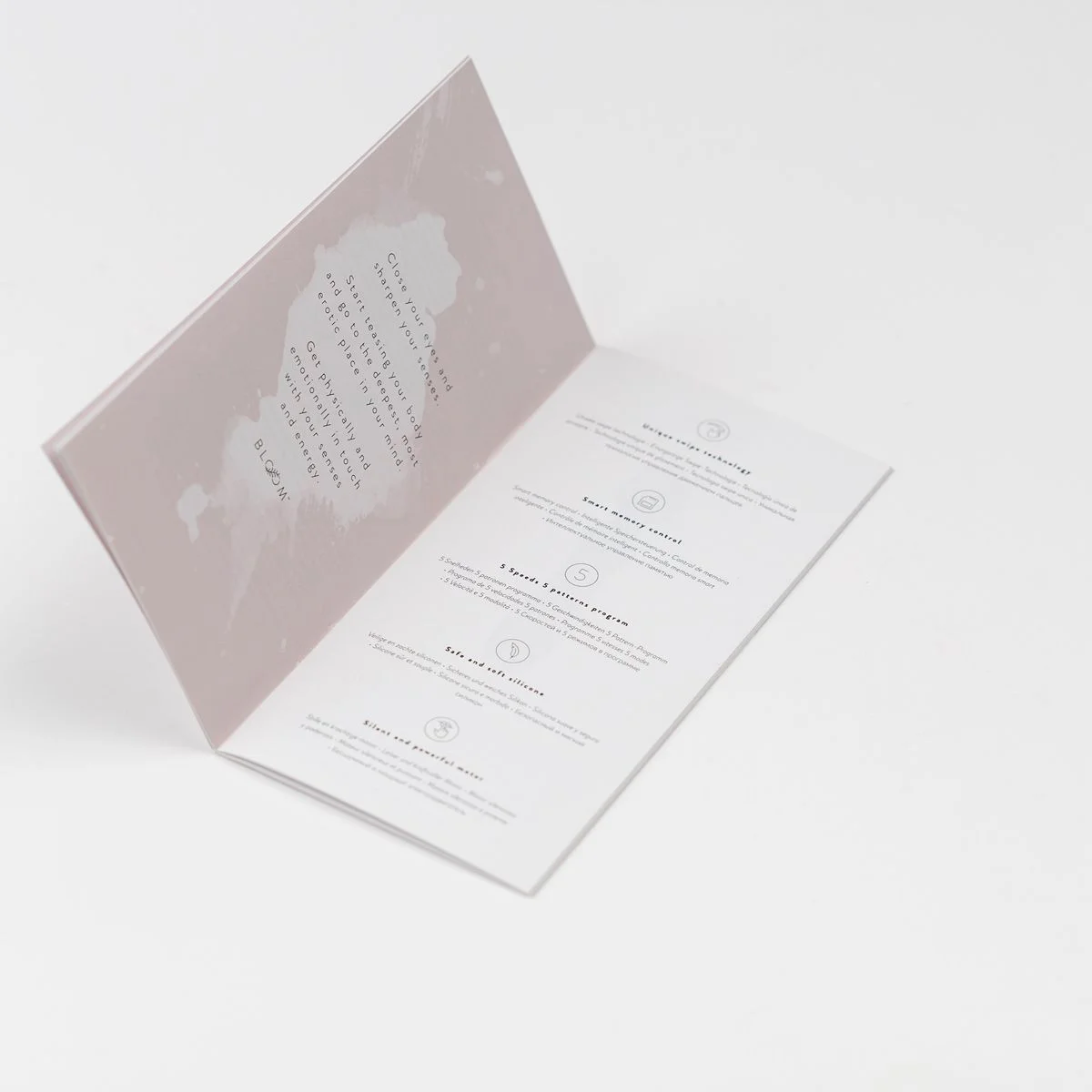 Deze vibrator is voorzien van een unieke swipe technologie, wat het nog makkelijker maakt om het speeltje naar jouw eigen voorkeur in te stellen. Dit werkt als volgt: zet de vibraties aan en kies je favoriete patroon met het knopje op het handvat. Veeg daarna met je duim over de blaadjes naar links of rechts om de vibraties harder of zachter te zetten. Er zijn 5 verschillende patronen en 5 snelheden per patroon.