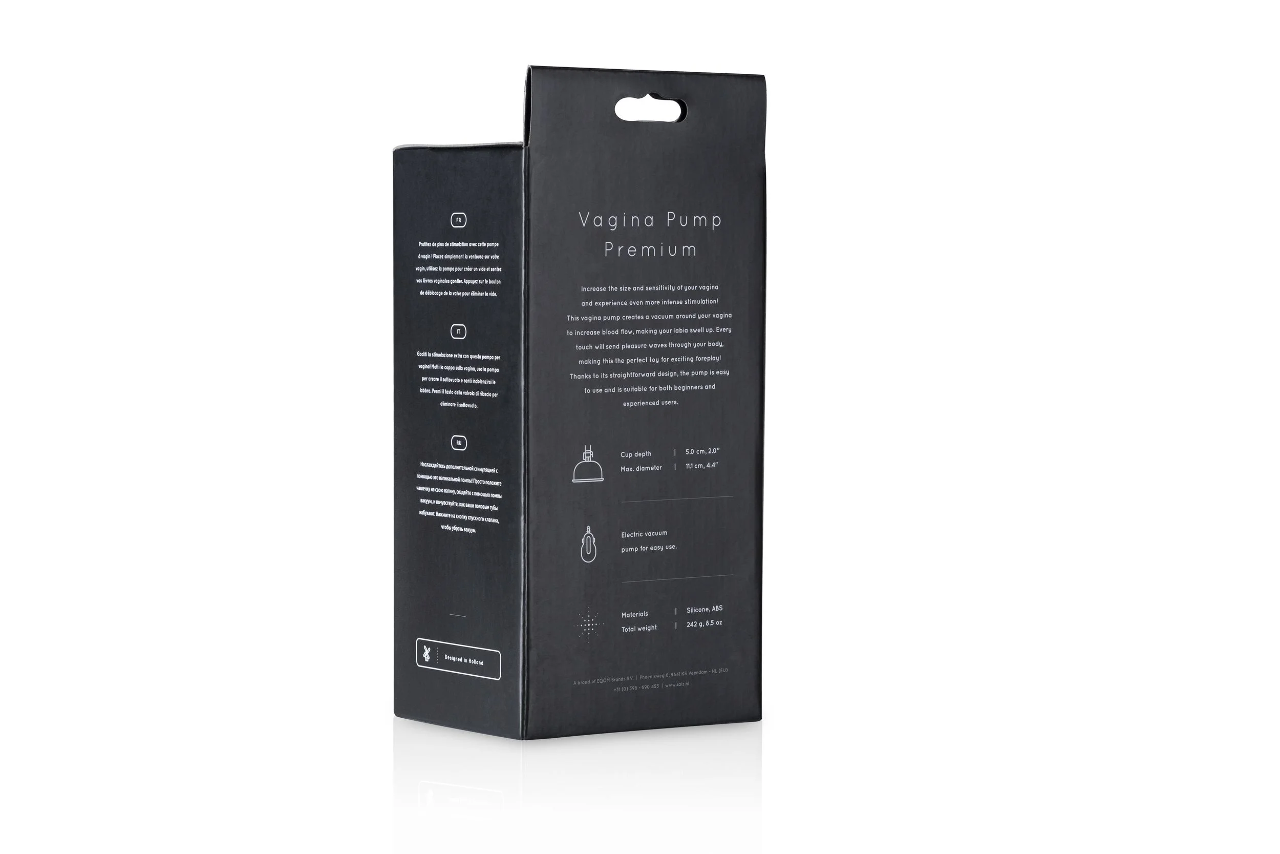 De vaginapomp premium kwam in een mooie luxe verpakking. De verpakking oogt erg luxe ondanks zijn simplistische grafische vormgeving. Niet alleen de verpakking maar ook de vaginapomp premium oogt en voelt aan van hoge kwaliteit. De handleiding geeft niet alleen de gebruiksaanwijzing aan van de vaginapomp premium maar ook van andere verschillende vacuümpompen vanuit het merk Saiz. De vacuum cup en de automatische vacuum pomp zitten los van elkaar in de doos en moet je eerst zelf in elkaar klikken.. gelukkig kan een kind de was doen.