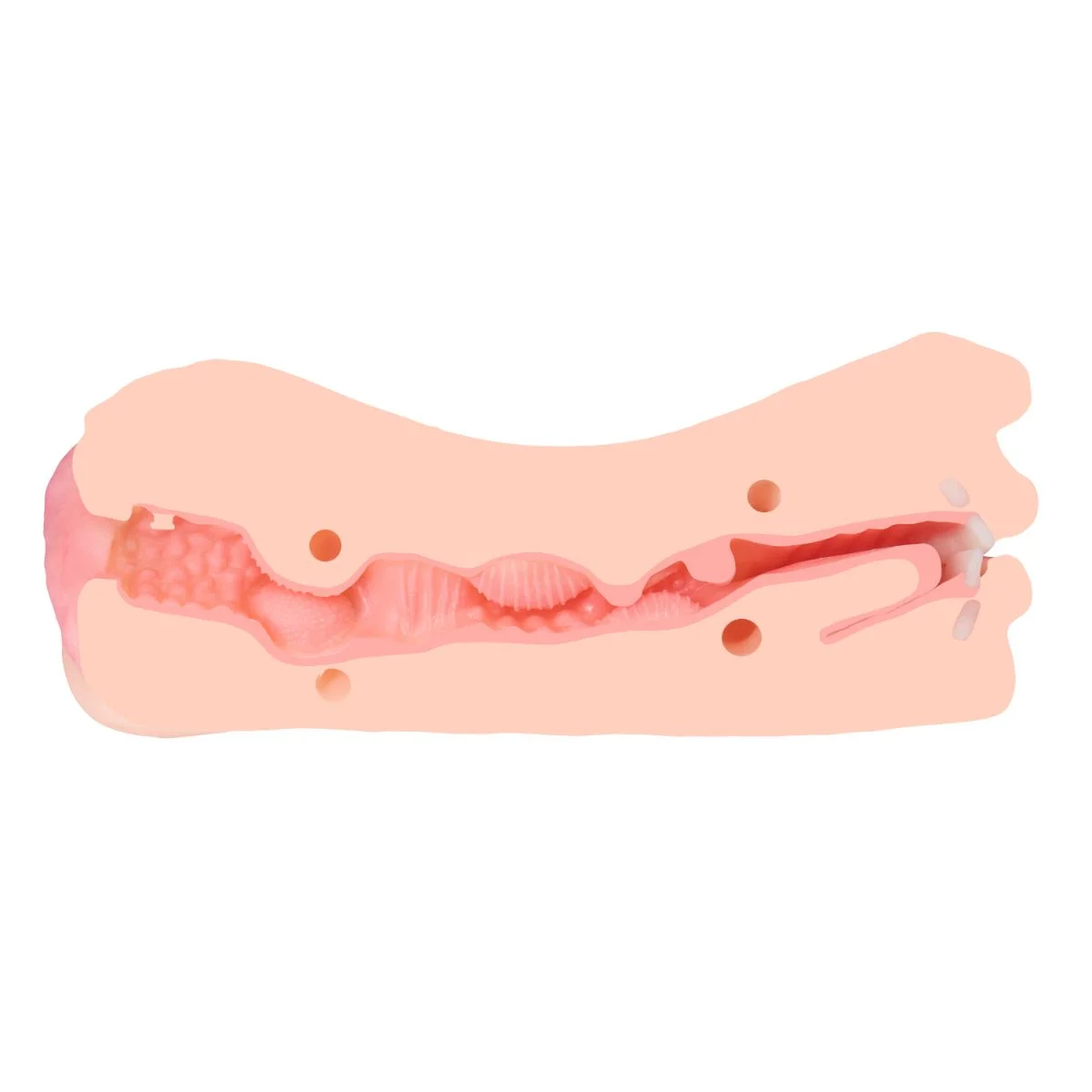 Kies je voor de vaginale zijde, dan wacht een geheel andere beleving. De ingang is strak en soepel, met interne ribbels en ringen die zich om je heen sluiten bij elke beweging. Die slimme structuur zorgt voor een ritmische, pulserende stimulatie die zich opbouwt tot een krachtige climax.