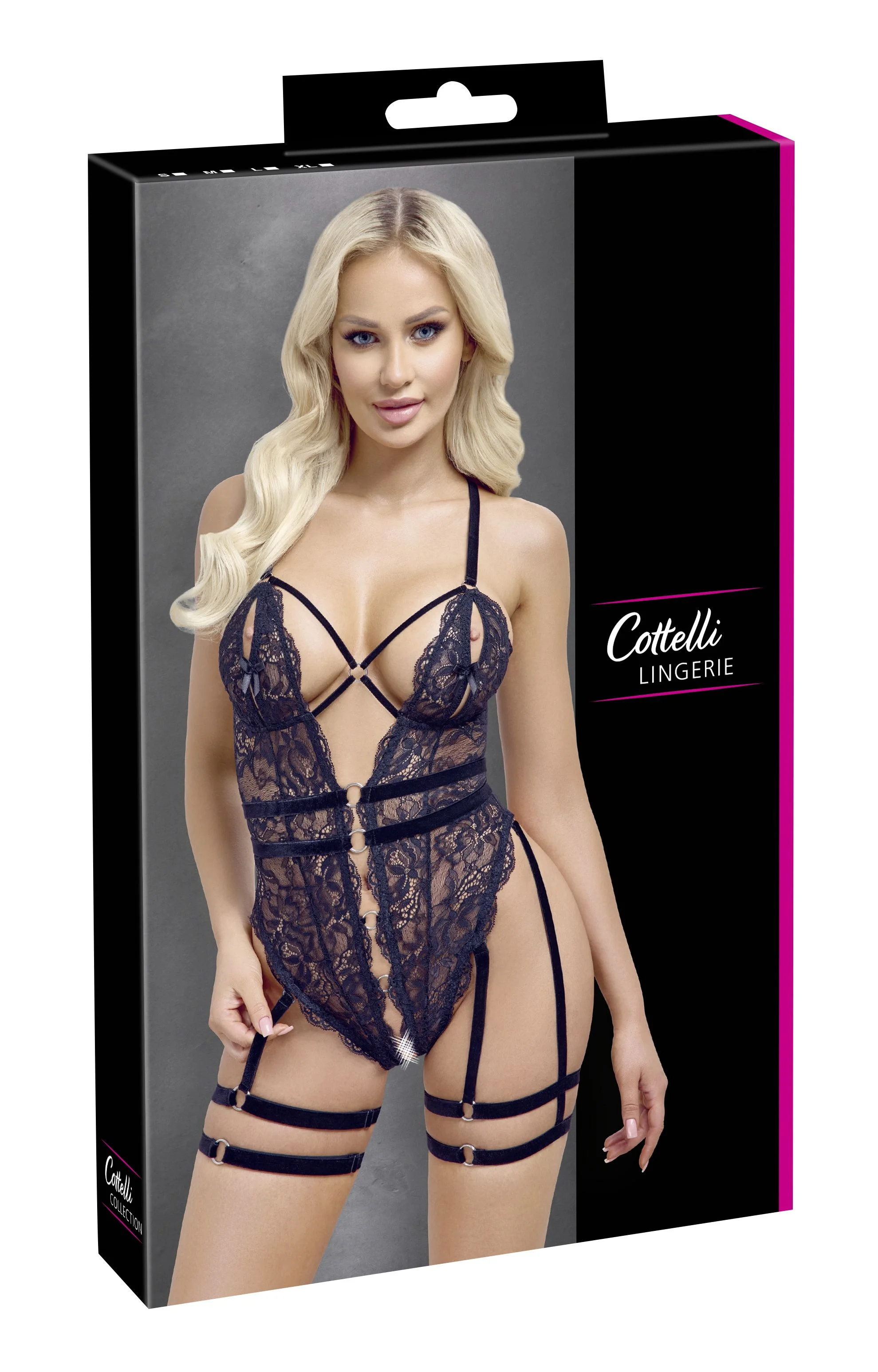Verleid met deze zwarte, crotchless string body van Cottelli LINGERIE in een elegante kanten uitvoering. Het zachte, rekbare materiaal sluit perfect aan en benadrukt de vrouwelijke vormen. Voorzien van verstelbare beha- en dijbandjes, afneembare dijdecoraties en sierlijke ringen in het decolleté. De open, verleidelijke snit en de kanten cups met haaksluitingen maken dit item een opvallend en sensueel kledingstuk voor bijzondere gelegenheden.