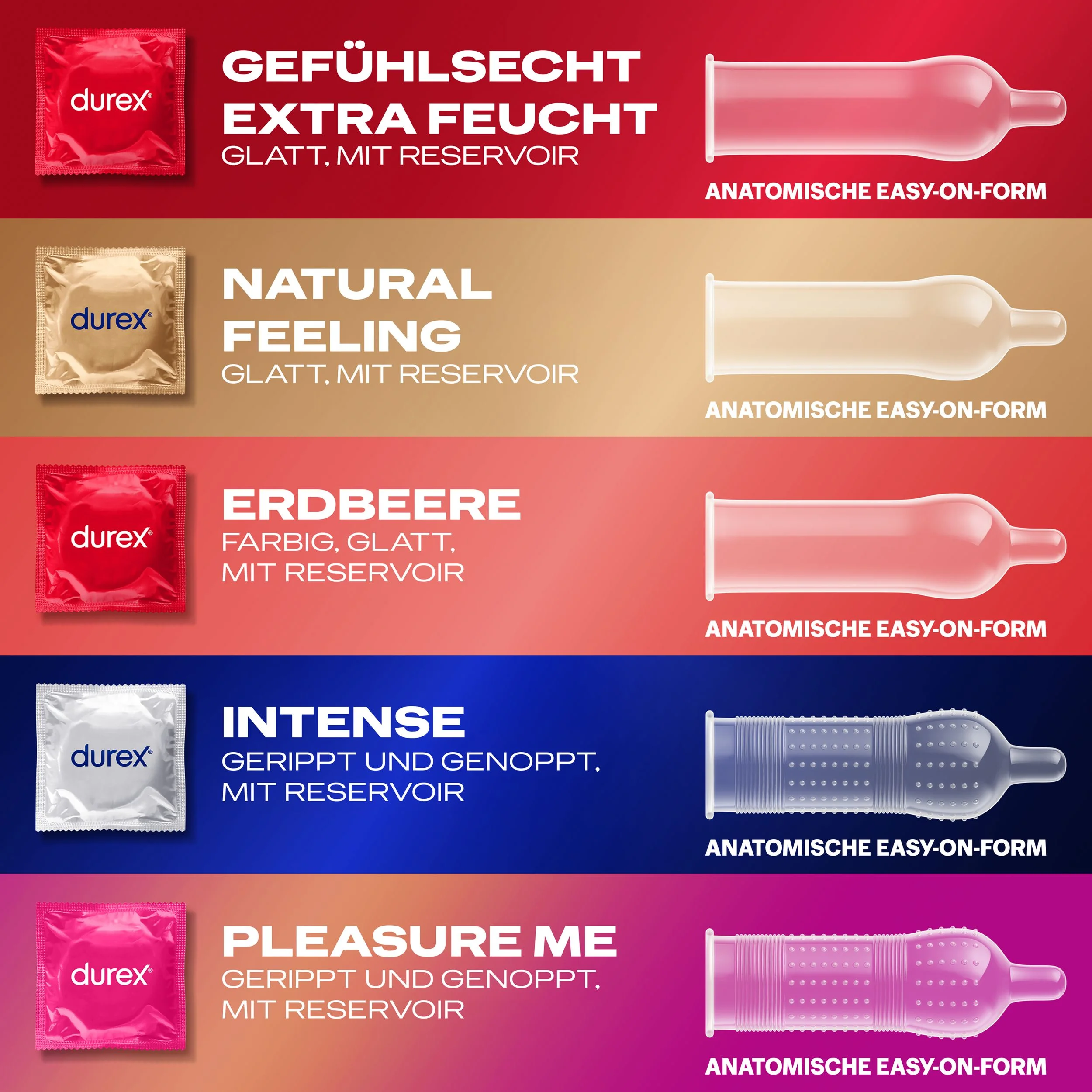 Elke condoom in deze set is voorzien van een comfortabele pasvorm en een handig reservoir voor extra veiligheid. Het glijmiddel op siliconenbasis zorgt voor een soepel en prettig gevoel, waardoor het gebruik nog aangenamer wordt. Een van de varianten is zelfs verrijkt met Desirex-gel en biedt een uniek Warm & Cool-effect dat voor verrassende prikkels zorgt. De aardbei-aroma variant voegt daarnaast een speelse en zoete dimensie toe aan jullie momenten samen.