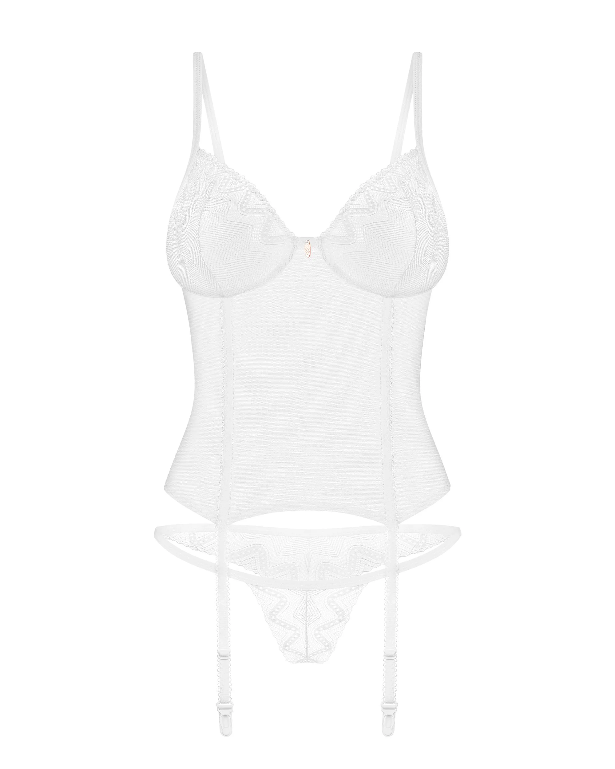 Een verleidelijke set ontworpen met zelfverzekerde vrouwen in gedachten. Het combineert interessante details, doorschijnend wit en kanten inzetten. Deze lingerie zal je onweerstaanbaar laten stralen en alle aandacht naar jou trekken.