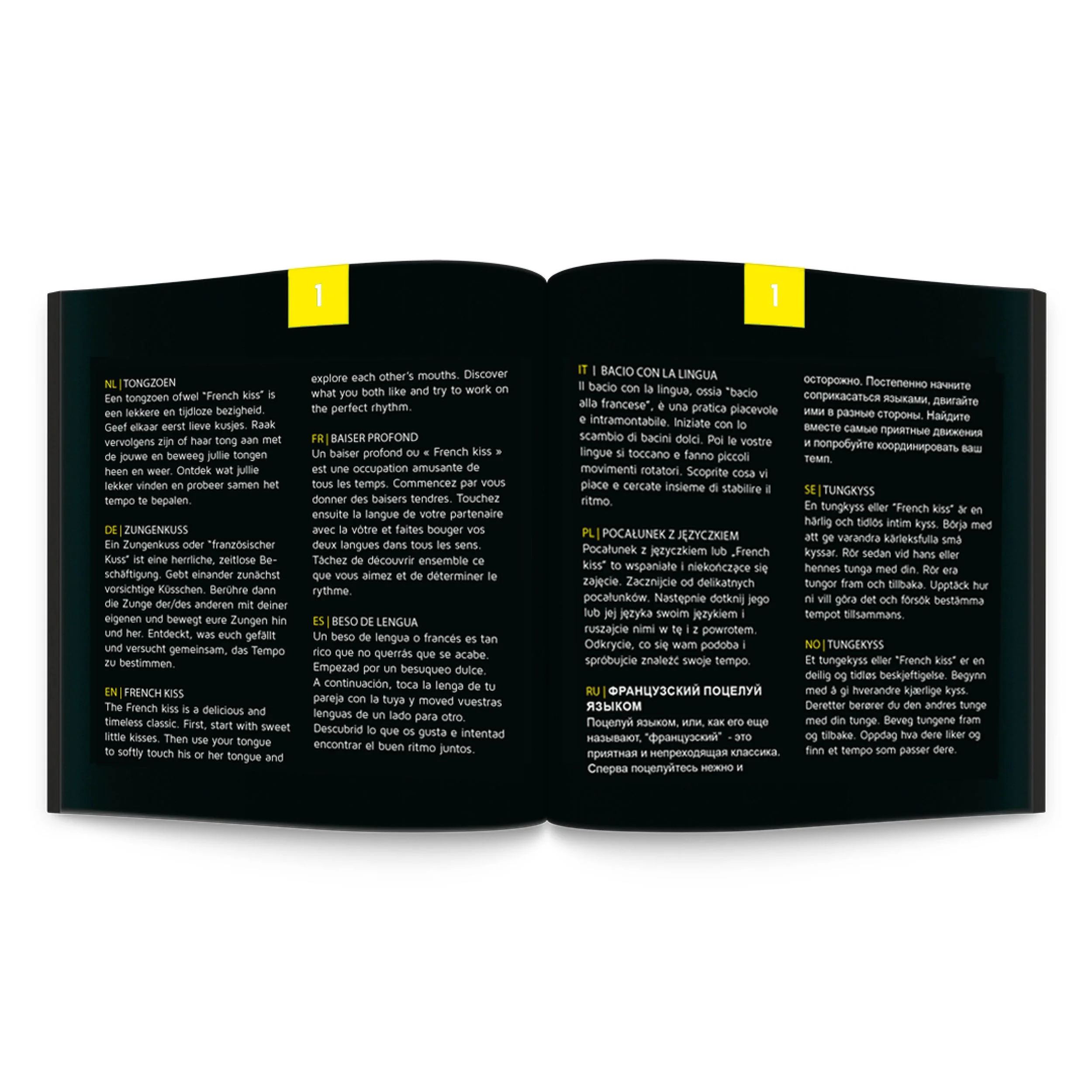 24 Uitdagingen voor intieme zoenen! [MEER INFORMATIE] Sex Roulette is een intiem spel van Tease and Please. Het begint met een kus ... maar welke? Verhoog de opwinding in je liefdesleven met slechts één draai van de pijl op het bord. De pijl wijst naar het nummer dat bepaalt welke intieme kus voor jou in petto is. De 24 uitdagingen in de Kiss-editie zijn beschikbaar in 10 talen: Engels, Spaans, Duits, Nederlands, Pools, Russisch, Italiaans, Zweeds en Noors, en geven een opwindende draai aan je seksleven voor nog meer gepassioneerde zoenen. Laat je verrassen, plezieren en verleiden, en vooral: neem de tijd om van elkaar te genieten. Kussen zal altijd leuk blijven! Sex Roulette is beschikbaar in de volgende versies: Foreplay, Kama Sutra, Kinky, Love & Marriage, Kiss and Naughty Play.