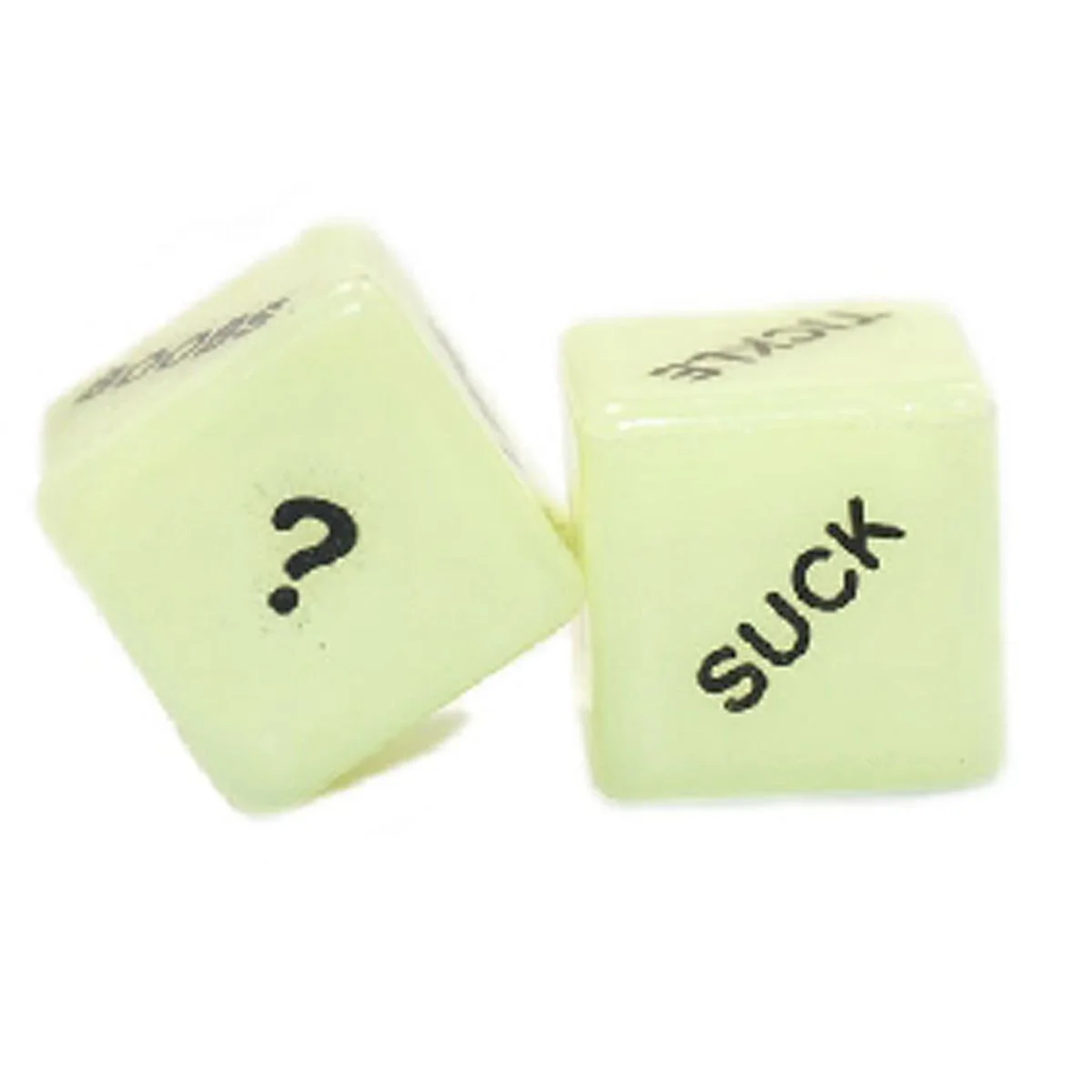De ene dobbelsteen heeft de acties: Kiss, Touch, Tickle, Lick, Suck, Massage.